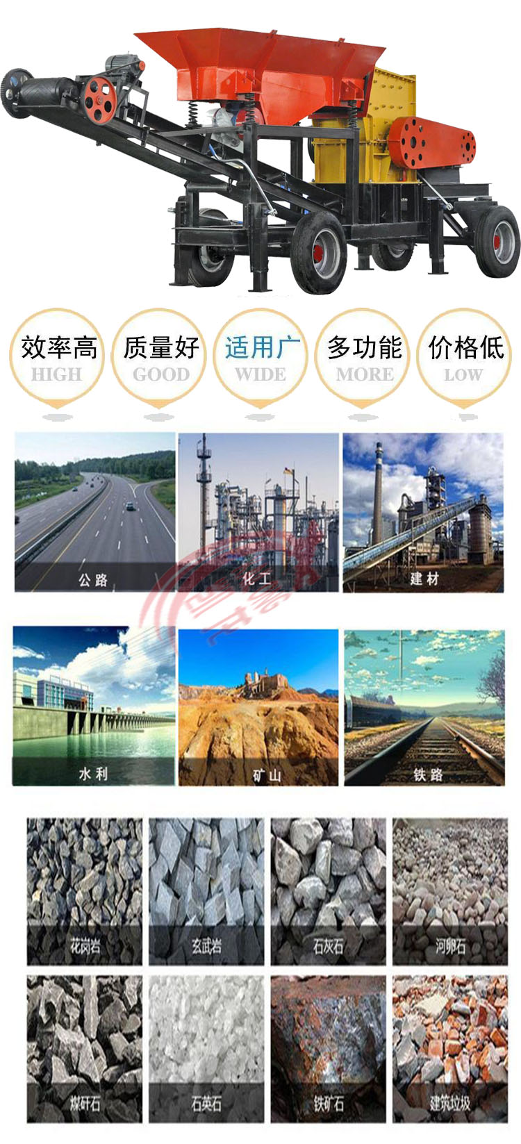 移動破碎機可破碎建筑垃圾、煤矸石、煤炭、河卵石、石英砂、花崗巖、玄武巖、鐵礦石、石灰石、石英石等,尤其是需要搬遷作業的物料加工、流動性石料處理,常用在建筑垃圾處理、砂石料場、礦山開采、煤礦開采、混凝土攪拌站、干粉砂漿、電廠脫硫等領域中。