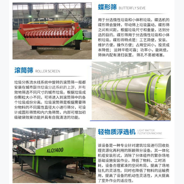垃圾分揀設(shè)備可搭配不同的處理規(guī)模,利于推廣應(yīng)用;分揀效率高,分揀效果明顯,降低運輸成本,簡化了分揀工藝流程。